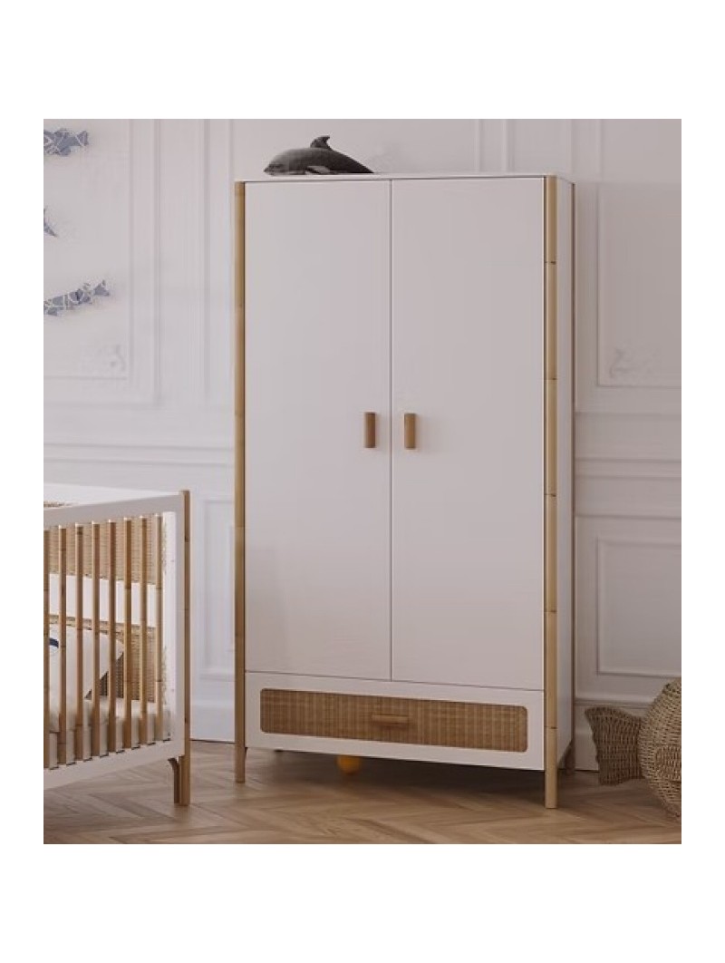 Un grand tiroir, deux portes avec penderie et étagères : une armoire pratique et moderne, avec ses tiroirs en tressage de rotin et ses pieds en canne de rotin. Glissières des tiroirs et charnières des portes à fermeture douce. Poids et dimensions : Dimensions extérieures (L x l x h) : 90 x 52 x 175 Poids du colis : 74 Kg (3 cartons) Matériaux et finitions : Rotin, MDF et bois massif (cèdre blanc) issu de forêts écologiquement gérées. Peintures et vernis à base d’eau, sans solvants ni émanations. Couleurs et échantillonnage : Coloris Neige : blanc DISPONIBLE SOUS 4 SEMAINES