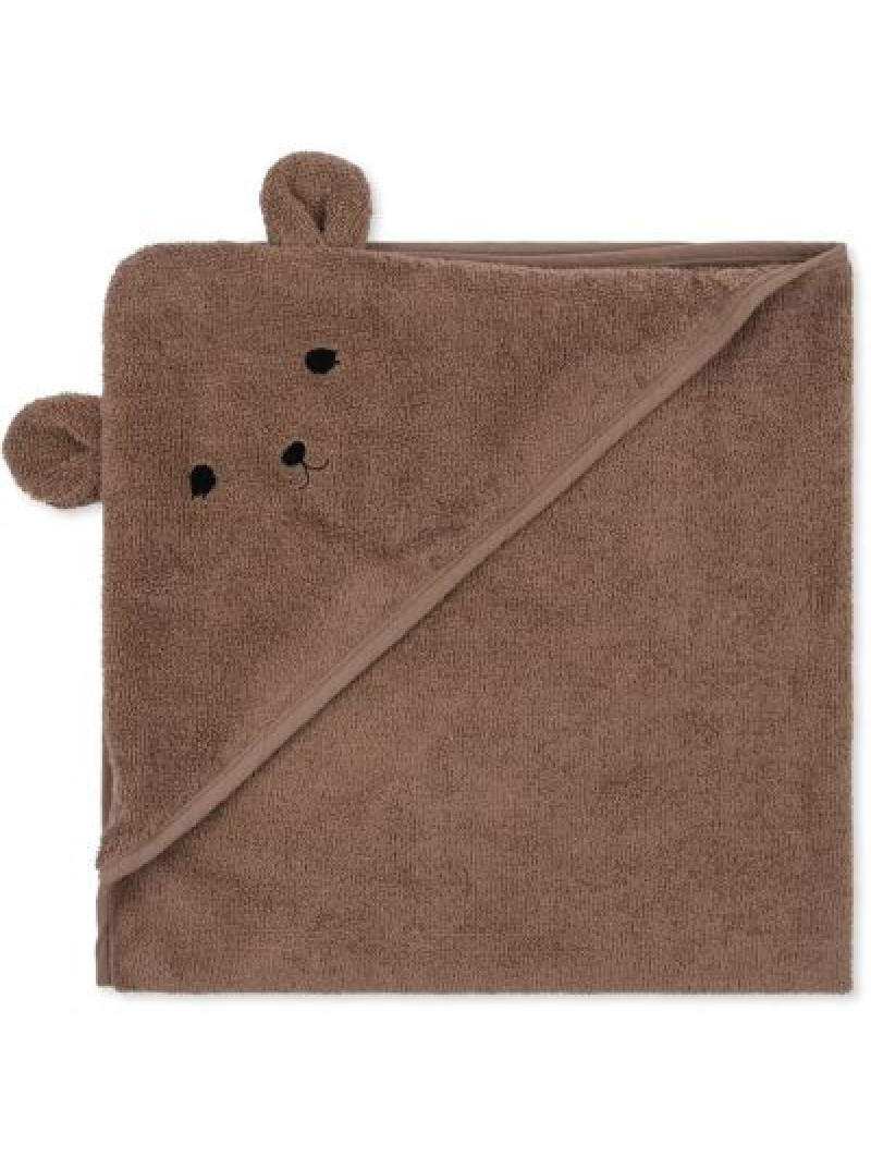 Cette jolie cape de bain à capuche est fabriquée dans le coton biologique le plus doux. La serviette de coloris taupe a un joli visage d'ours avec ses oreilles sur la capuche. Elle sera parfaite pour sortir bébé du bain.