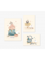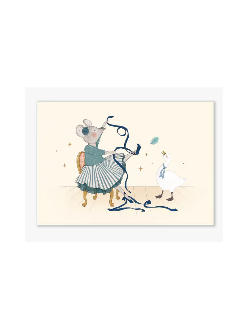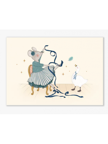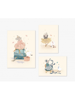 Set de 3 affiches illustrées de petites souris et leurs amis cygnes représentant l'univers délicat et poétique de la collection la petite école de danse. Imprimé en France à base d'encres végétales sur du papier certifié FSC.