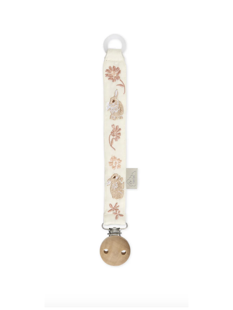 Fabriqué en coton biologique certifié GOTS, ce charmant porte-sucette est orné de délicates broderies.