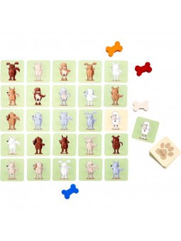 Contenu: 25 cartes-photos de chiens, 25 cartes « vue de dos », 4 os en bois, 1 règle du jeu.