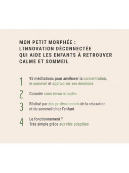 Informations Techniques: Mon Petit Morphée aide à retrouver le calme et à s'endormir grâce aux 128 voyages audio à travers lesquels l'enfant développe :