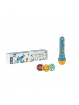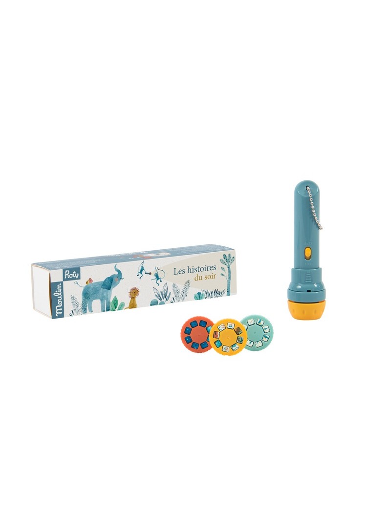 Informations Techniques : Lampe torche de poche où chacun des 3 disques projetés sur le mur raconte une histoire. Elles racontent les aventures douces et joueuses des animaux de Sous mon baobab. Un instant magique pour développer l'imagination des enfants...