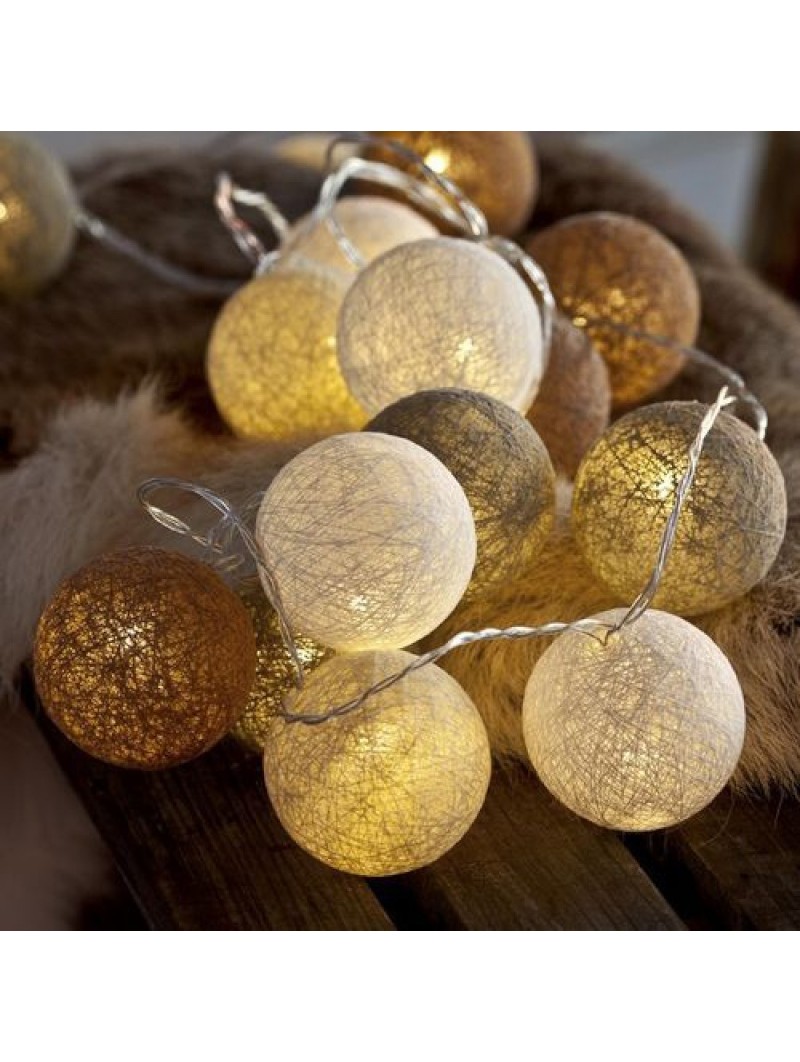 Une longue guirlande à l'effet nature qui diffuse une lumière chaleureuse. Les boules de coton, fabriquées à la main, sont gold. Le cordon les reliant est discret et de bonne qualité.
