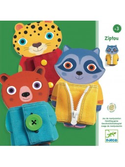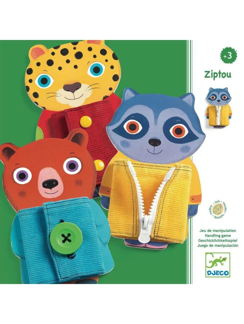 Informations Techniques : Découvrez le jeu de manipulation Ziptou de Djeco, un coffret avec 3 animaux en bois avec chacun un vêtement en tissu à fermer, un jeu pour les enfants à partir de 3 ans. Votre enfant va exercer sa motricité en fermant la veste à bouton de l'ours, en glissant la fermeture à glissière du raton laveur et en fermant les boutons pressions du léopard. Des jouets en bois qui aideront votre enfant à s'habiller plus facilement, un jeu qui exercera sa coordination. Grâce à ces jouets éducatifs, votre enfant découvrira trois systèmes de fermeture : des boutons à clipser, un bouton à attacher et une fermeture éclair.