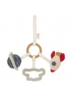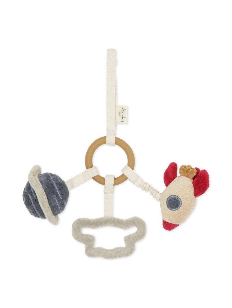Il y a un anneau en silicone sur lequel sont glissés de nombreux objets : une petite fusée spongieuse à mâcher, un planète pour jouer, un anneau de dentition.