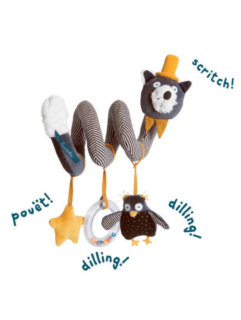 Informations Techniques : Spirale d'activités Alphonse le chat et son beau chapeau ! Il transporte avec lui un hibou hochet, un anneau à billes et une étoile pouët pour éveiller les sens de bébé. Un jouet à enrouler partout : dans son lit, dans sa poussette ou dans son cosy.