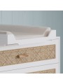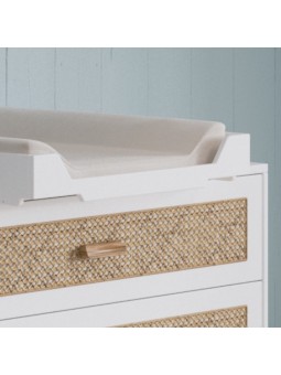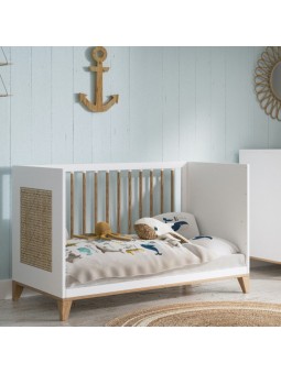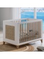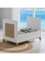 Un lit évolutif avec de jolis panneaux en cannage de rotin natuel, qui accueillera bébé pour de douces nuits. Il se transforme en lit enfant ou sofa. Il est conçu pour un matelas de 60 x 120 cm (non inclu). 5 configurations sont possibles : 2 hauteurs de sommier (medium ou basse) Position Sofa en enlevant un des deux côtés à barreaux En option : Deux côtés évolutifs : position lit évolutif avec un seul côté évolutif de monté et position lit enfant avec les deux côtés évolutifs installés La box à langer : peut s’adapter sur le lit, sans adaptateur, de façon sécure et confortable pour vous. Poids et dimensions : Dimensions extérieures (L x l x h) : 124,2 x 65 x 78 Dimensions du matelas : 60 x 120 cm (non inclus) Poids du colis : 37 Kg (2 cartons) pour le lit seul Matériaux et finitions : Cannage de rotin, MDF et bois massif (cèdre blanc) issu de forêts écologiquement gérées. Peintures et vernis à base d’eau, sans solvants ni émanations. Couleurs et échantillonnage : Coloris Neige : blanc DISPONIBLE SOUS 4 SEMAINES