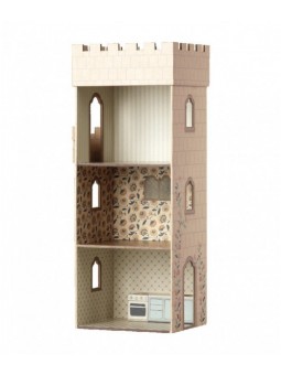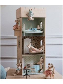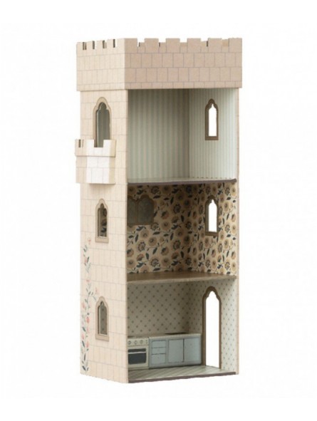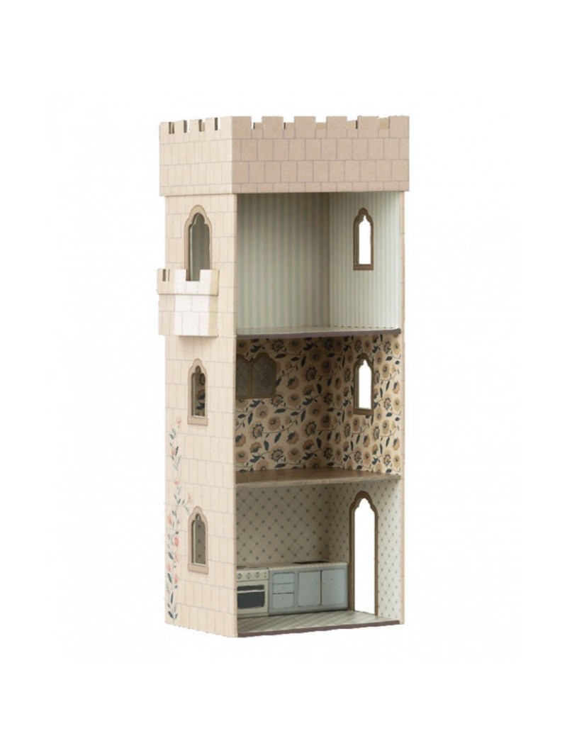Informations Techniques: Château en carton Maileg présentant 3 différents étages, une cuisine intégrée et un petit balcon. Château en carton certifié FSC Adapté pour les petites souris de la marque