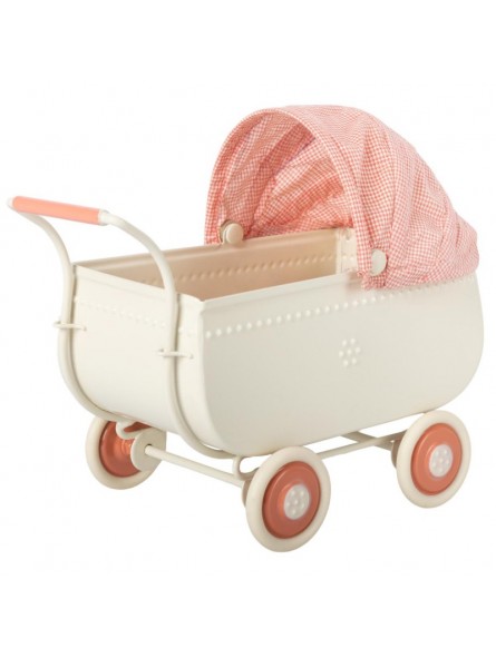 Informations Techniques: Landau pour souris et lapin Maileg taille Micro. Caisse de landau et roues en métal agrémentées de détails d'ornements rétro. La capote en coton est souple et se rabat. Parure de landau 3 pièces assorties.