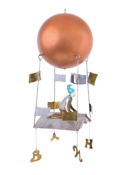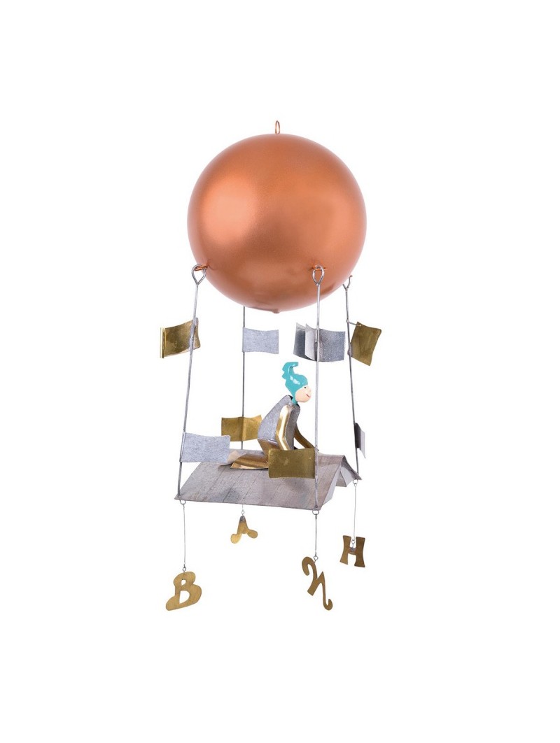 Mobile de décoration en métal à suspendre représentant un petit garçon entouré de livres et de lettres. Décoratif, hypnotique, délicieusement foldingo et poétique, voici une bien belle machine à stimuler l'imagination.