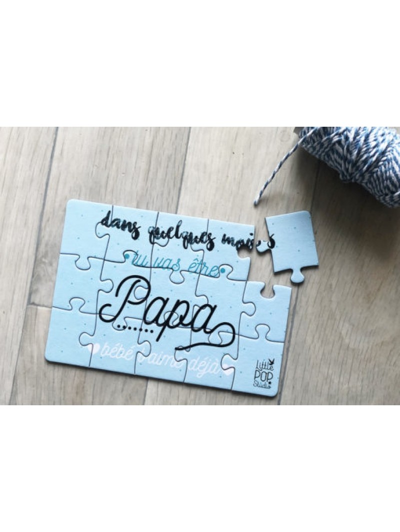 Informations Techniques : Une superbe carte puzzle pour annoncer au futur papa qu’un bébé est en route ! Vous allez adorer observer la réaction du papa. Ce puzzle bleu, en format A6 (14,8 cm x 10,5 cm) est en carton épais et d’excellente qualité. Le futur papa devra recomposer le puzzle pour y lire ce message : Dans quelques mois, tu vas être papa, bébé t’aime déjà